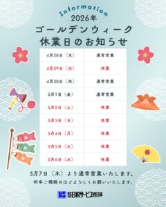 ゴールデンウィーク期間中の営業日について下記のとおりご案内致します。